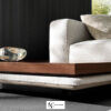 Основание, на которое опираются мягкие объемы, выполнено из продуманной комбинации материалов: полностью из кожи или ткани или из оригинального сочетания обоих материалов для создания еще более изысканного и престижного вида. В тканевом варианте две планки соединены застежкой-молнией, скрытой складчатым швом, представленным как эстетический мотив, позволяющий практично и быстро снять обивку. С другой стороны, в основе, полностью покрытой кожей, покрытие имеет нахлест: изысканная и вдохновленная миром высокой моды, эта технология производства означает, что полоски кожи сшиваются вместе путем подгибания краев.