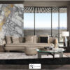Металлическое основание с отделкой светлой бронзы приподнимает конструкцию над полом, создавая эффект парения, и служит визуально лёгким акцентом.