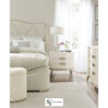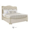 Корпус кровати полностью обтянут кремовой бархатной тканью, а волнистый ободок подчеркнут золотистой каймой и двойной цепочкой декоративных гвоздей. Аристократичные нотки чувствуются в элегантной прошивке изголовья. Из-за невысоких ножек рама кровати расположена относительно низко над полом, что делает ее исключительно удобным предметом мебели для большой спальни.