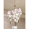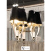 Латунный каркас в полированном золотом покрытии; латунные рожки в форме усеченного конуса; элемент из выдувного шлифованного свинцового хрусталя, отделка травлением. Черный тканевый абажур с глянцевой золотой отделкой внутренней части; Подходят все типы лампочек E27 60W — 8W LED каждая. Для люстры — 9 ламп. Вес кг 40. Также доступны абажуры с графикой «Приключения в море» и «Цветы&Вороны».