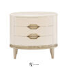 Эту великолепную овальную тумбу с трапециевидными ножками, изготовленную из древесины клена с кремовой отделкой, выделяет резной орнамент основания, напоминающий тонкую нейлоновую ленту, покрытую серебристой сияющей краской. Модель снабжена тремя ящиками закругленной формы, которые скромно украшают оригинальные утопленные ручки.