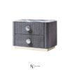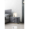 Giorgio Collection Charisma — прикроватная тумба отделана простеганным нубуком серого цвета. Верх – из серого мрамора Alpi с фацетом. Основание из хромированной нержавеющей стали цвета светлого золота. 2 большие центральные ручки выполнены в комбинации из хромированной нержавеющей стали золотого цвета и серого мрамора Alpi. 2 полностью выдвижных ящика внутри отделаны бархатом.