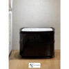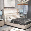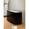 Прикроватная тумба с 2 ящиками; центральная часть корпуса полуовальной формы из изогнутого по периметру дерева. Внешняя часть корпуса окантована рельефным профилем; глянцевая лакированная отделка или обтяжка кожей. Мраморная столешница встроена в фигурную раму из массива дуба в отделке с открытыми порами, черный лак. Основание конической формы из черного дерева; нижний металлический профиль в матовой отделке. Внутренняя отделка ящиков из шпона черного дуба и черной микрофибры.