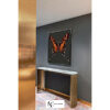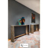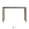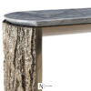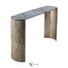 Консоль из мрамора и алюминия. Фигурная мраморная столешница со скошенным краем. Ножки из антикоррозионного литого алюминия, полученного путем художественного литья с использованием мелкого песка для создания текстуры древесной коры; пескоструйная обработка, ручная полировка. Опорный корпус из металла с порошковым покрытием; отделка коробчатым профилем из нержавеющей стали. Металлические детали предлагаются в различном ассортименте отделки.