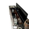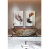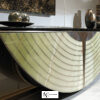 Барная консоль со структурой из фанеры и МДФ, окрашенных в цвета RAL или перламутровые, или из шпона с блестящей отделкой. Передняя панель из мрамора с арочной обработкой, со вставками из натуральной нержавеющей стали и кожи. Центральная отделка и внешняя рама из сатинированной нержавеющей стали доступны в вариантах отделки из сатинированного металла. Откидная крышка с демпфирующими петлями и внутренней частью из матового лака с зеркальным дном и полками из экстрапрозрачного хрусталя. Предусмотрен для крепления к стене. Опция: встроенная аудиосистема Bluetooth с 2 диффузорами ВЧ-СЧ и 1 блоком сабвуфера (макс. 400 Вт) с разъемами USB для подзарядки портативных устройств.