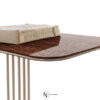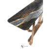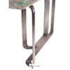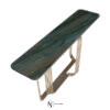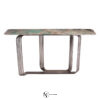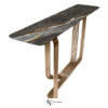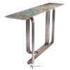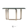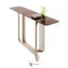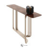Консоль с хромированным каркасом из соединенных между собой изогнутых металлических труб. Доступна версия со стеклянной столешницей толщиной 12 мм из дымчатого стекла со скошенным краем; основание соединено со столешницей с помощью опор из алюминия и нержавеющей стали, сваренных лазерной УФ-сваркой. Версия с мраморной столешницей: мраморная плита 20 мм с фаской по краю и нижними крепежными втулками. Предусмотрено крепление к стене с помощью специального анкерного кронштейна под верхней частью. Металлические части могут быть в различных вариантах отделки металла; стеклянная столешница доступна в дымчатом, бронзовом, сверхпрозрачном вариантах. Мраморная столешница также доступна с декоративным микротиснением «крокодил», выполненным вручную Диего Крестани на мраморе Port Laurent.