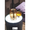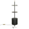 Стеллаж также включает небольшой шкаф, который создается путем сближения планок из цельного кленового дерева и черной кожи, а затем снова планок из кленового дерева. Круглая столешница и внутренняя полка шкафчика изготовлены из стекла, окрашенного в черный цвет.