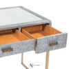 Этот стильный стол, напоминающий мебель Западного побережья 1940-х годов, покрыт цинковым искусственным шагренем с контрастными ножками из латуни и люцита. Цинковое покрытие представляет собой наносимое вручную покрытие, которое формуется и затирается вручную. В результате отделка уникальна как по внешнему виду, так и по текстуре.