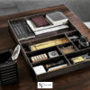 Письменный стол Linha Studio из древесины палисандра. Изделие отличается поразительной визуальной лёгкостью и выверенными до совершенства пропорциями. Толщина столешницы составляет всего 16 мм, что придаёт модели особое изящество. Под столешницей с левой стороны расположены два ящика для документов, также на столешнице расположено отверстие для проводов.