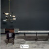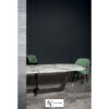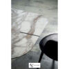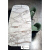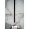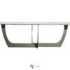 Столешница в форме вытянутого прямоугольника со скругленным углами выполнена из великолепного мрамора Calacatta Oro и опирается на скрещенные между собой металлические ножки.