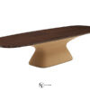 Отличительной особенностью модели является ее солидная основа, обтянутая кожей с прострочкой из алмазного стеганого одеяла. Широкая столешница доступна в Ebony Macassar или в шпоне корня шиповника с полированной, матовой отделкой. Это контрастирует с матовым лакированным плинтусом, согласованным по цвету с основанием.