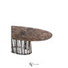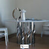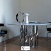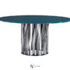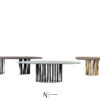 Изгибы алюминиевой основы в сочетании с мраморной столешницей, лакированным стеклом или орехом каналетто создают захватывающий скульптурный стилистический эффект, объединяя умеренность и фантазию в подлинном вызове границам природы и материи.
