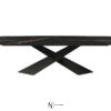 Фигурное, массивное основание стола в виде широкого, расположенного под острым углом к полу и столешнице креста изготовлено из полированного металла с покрытием матовым лаком, представленного в нескольких вариантах цветового исполнения. Вместительная столешница прямоугольной формы представлена в различных вариантах исполнения: с острыми или закругленными углами, с раскладным механизмом для увеличения площади поверхности и без него. В качестве отделки используется керамика, массив дерева или обожженное стекло.