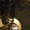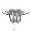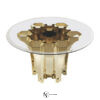 Металлическая основа обеденного стола доступна во всех отделках коллекции. Верх сделан из скошенного натурального или бронзового стекла. Логотип RC изготовлен из расплавленной латуни с отделкой из платины или золота.