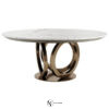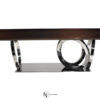Fendi Galileo — стол обеденный на площадке, соединительные стойки из металлических отполированных колец серебристого или золотистого цвета, установленных в разном положении, столешница ровная из массива дерева под лаком.