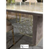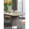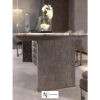 Обеденный стол с мраморной столешницей. Основание состоит из деревянной боковины в обивке из кожи и внутренней секции из шлифованного металла с вырезанным декором «Sequence». Возможны другие варианты отделки и обивки.