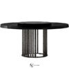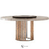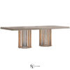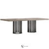 Обеденный стол с прямоугольной или круглой столешницей из дерева, опирающейся на два или одно круглых металлических основания. Центральная вставка может быть сделана из стекла или дерева.