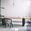 Стол с обтекаемым металлическим основанием и закругленной столешницей. Топ может быть выполнен из керамики, различных сортов дерева и мрамора. Возможен заказ круглого стола.