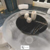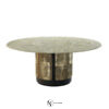 Несущая конструкция из бетона и литого алюминия с окрашенной вручную полированной поверхностью. Железобетонная часть обработана эрозионно-стойким покрытием и окрашена в черный матовый цвет. Столешница из сверхпрозрачного стекла толщиной 20 мм обработана вручную методом аэрографии и защищена средством против пятен. Алюминиевые детали предлагаются в различных вариантах металлической отделки. Общий вес около 200 кг. Возможен вариант с мраморной столешницей с поддерживающим корпусом из лакированного дерева; дополнительно можно заказать крутящуюся мраморную подставку «lazy susan», утопленную в столешницу.