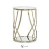 Круглый акцентный столик оснащен металлическим каркасом в финишном покрытии Whisper of Gold и дополнен зеркальным основанием. Столешница выполнена из прозрачного плотного стекла.