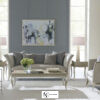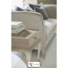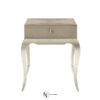 Столешница, изготовленная из древесного шпона, покрыта песочным оттенком Moonlit Sand, что придает визуальную притягательность поверхности стола. Изогнутые ножки столика подчеркивает финишное покрытие оттенка Soft Silver Leaf. Декоративные элементы на ножках, выполненные из металла, гламурно завершают композицию.