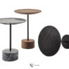 Столики выполнены из окрашенной черной древесины или ореха Canaletto, три типа мрамора, белый Carrara, черный Marquiña или серый Carnico для оснований и топов, или варианты с основаниями в трех типах мрамора со стеклянными столешницами разных цветов.