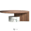 Главный визуальный акцент сделан на контрастном сочетании фактур и оттенков. Часть основания столика в виде цилиндра изготовлена из натурального мрамора в нескольких вариантах цветового исполнения с натуральными контрастными прожилками. К цилиндру крепится вторая, профильная часть основания, на которую установлена столешница круглой формы с отделкой шпоном