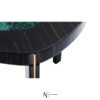 Столик на трех высоких ножках из массива дерева оттенка темный зебрано, фасадная грань со вставкой из металла, столешница треугольная с округлыми углами, на крышке вставка из зеленого мрамора.