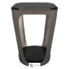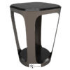 Столик на каркасе из металла с серым покрытием, столешница квадратная и напольная основа круглой формы из мрамора, контур шлифован клином, углы закруглены, четыре стойки расширяются к опоре.
