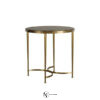 Массивная столешница круглой формы из мрамора удерживается на опоре с четырьмя латунными ножками и сварным х-образным элементом, соединенным посередине.