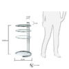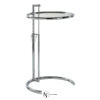 Столик представляет собой металлическую конструкцию, состоящую из регулируемой по высоте стойки и двух колец. Верхнее кольцо служит окантовкой для стеклянной столешницы. Она прозрачная, ударопрочная. Нижнее кольцо обрезано, является основанием. Для защиты напольного покрытия от повреждений, на нем предусмотрены войлочные подушки.