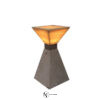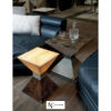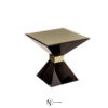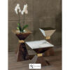 Столик оригинальной формы, с пирамидальным основанием. Возможен вариант в обивке из кожи. Для верхней части предусмотрены элемент из оникса с подсветкой и элемент из металла с емкостью из нержавеющей стали для бутылок или для растений и цветов. Столешница может быть выполнена из стекла, металла или мрамора.