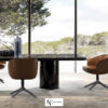 Кресла отличаются удобной посадкой, причем не только в большой, но и в меньшей модели, а также в обеденном варианте, который может быть как фиксированным, с ножками из ясеня цвета солодки, так и с поворотным четырехспицевым литым алюминиевым основанием цвета бронзы или полированной олова.