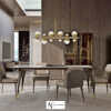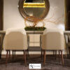 Стул имеет структуру из массива дерева; он доступен с кожаной или деревянной спинкой, а также с сиденьем из кожи или ткани. Детали из матового золотистого металла.